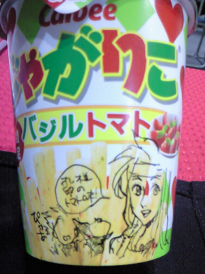 ○コンビニで惹かれて買った「じゃがりこのバジルトマト(ハートがちりばめられてる)」に